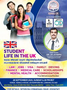 Kairali UK, in association with MAUK, is hosting a special seminar to support students arriving in the UK for higher education. The event, graced by Chief Guest Dr Jo Joseph, […]