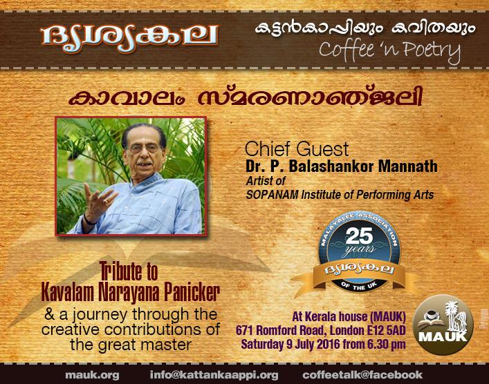 വലിയ കലാകാരനെ, അദ്ദേഹത്തിന്റെ സർഗ്ഗ സപര്യയെ സ്മരിക്കുന്നു. ജൂലൈ 9 ശനിയാഴ്ച, Kerala house ൽ 6.30 ന് ഏവരും എത്തിച്ചേരുക. കാവാലം നാരായണപ്പണിക്കർ രചിച്ച കവിതകളും, ഗാനങ്ങളും, അവതരിപ്പിക്കാൻ തയാറായി വരിക കൂട്ടരേ.