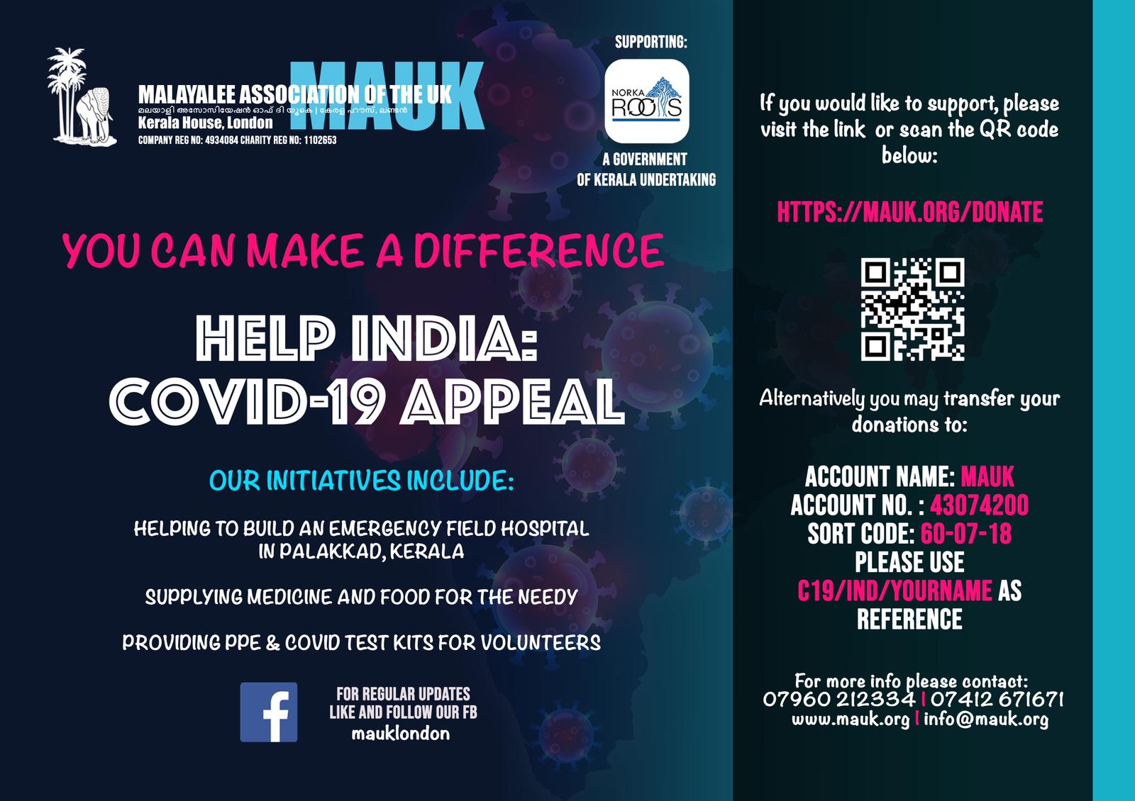 It is in such times of unprecedented challenges that the compassion and the resolve of human spirit is put to test. MAUK would like to make a meaningful contribution to relieve the suffering of families worst affected. Since the Government of India has lifted restrictions to import medical supplies, we are hoping to provide both medicinal supplies and PPE equipment to areas in dire need. NORKA Roots, a Kerala Government undertaking, has solicited the support of MAUK. We will be supporting victims in worst affected areas under the guidance of the District Collectors Office. Our humble efforts might be a drop in the ocean but we are reminded that the ocean is made of many drops, and even one life saved is worth our efforts. Our initial initiatives are to support the building of a field hospital in Pattambi in Palakkad, supply medicine and food for the needy and provide PPE & Covid Test kits for volunteers