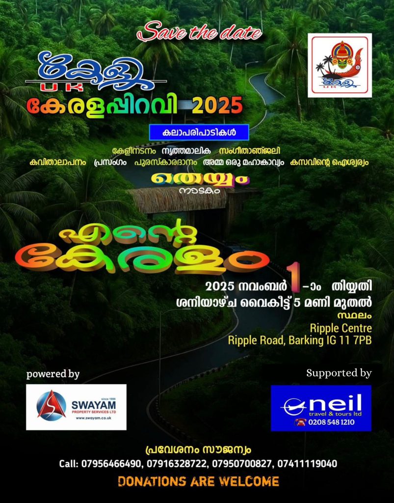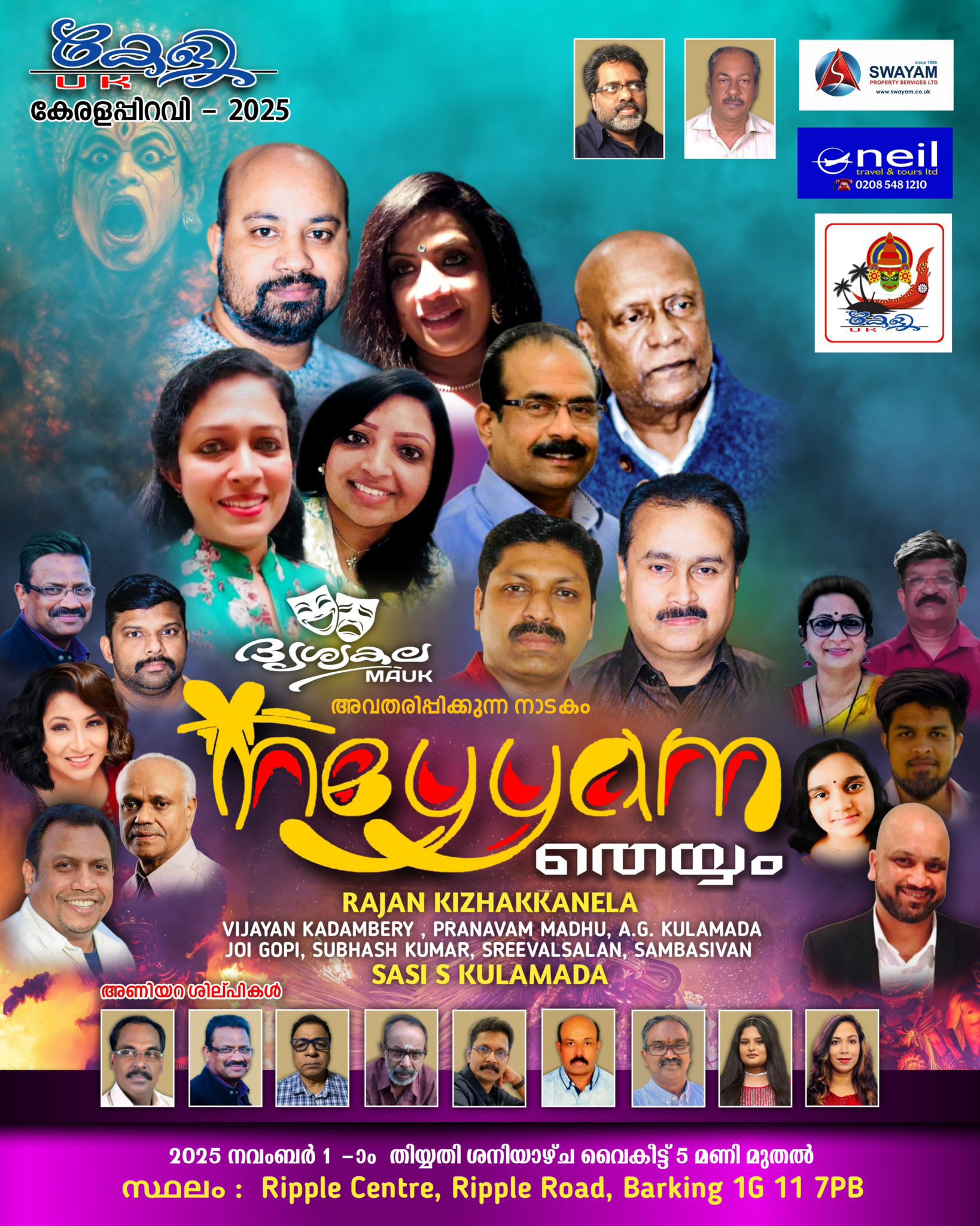 Back by popular demand, this evocative Malayalam stage drama returns for its third staging, exploring the spirit, struggle and resilience embodied in Kerala’s ancient ritual art form. Staged as part of KELI UK’s Ente Keralam – Keralapiravi 2025 celebrations, Theyyam stands as the evening’s feature performance, uniting storytelling, music and movement in a deeply human portrayal of faith and identity. 💃🎶 The programme will also include an array of captivating dance performances, soulful music, poetry recitation, inspiring speeches and the prestigious Keli Awards, recognising excellence within the UK Malayalee community. ✨ Adding a touch of elegance, “Kasavinte Aishwaryam” will present Kerala’s timeless style through a stunning fashion showcase. 📅 Date: Saturday, 1 November 2025 Donations are welcome Join us for an evening that celebrates Kerala’s cultural pulse — where tradition meets performance and stories come alive.