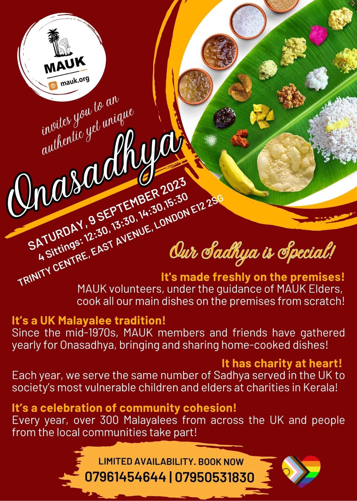 MAUK Onam Sadya 2023 On Saturday 9/9/2023 Child £10, Member £15, Non member £17