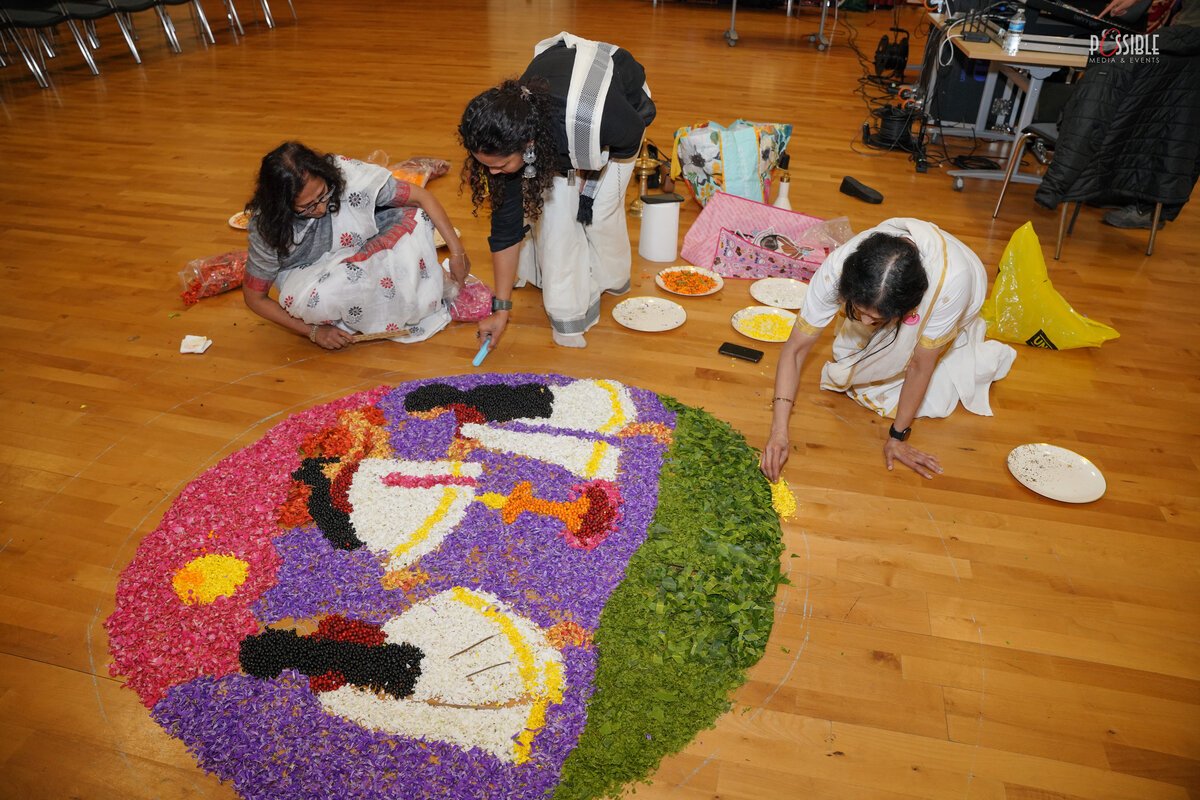 The morning session featured the Unity Festival, a free community event supported by the London Mayor’s Community Weekend initiative. Visitors enjoyed cultural activities including a Chenda workshop led by M.A.U.K.’s own Chenda students and a Kalaripayattu workshop delivered by the tutor and students of M.A.U.K.’s Kalari class. A traditional athappookkalam (floral carpet) was created by M.A.U.K. volunteers, while guests also enjoyed henna artistry and sampled a mini onasadhya, Kerala’s festive feast.