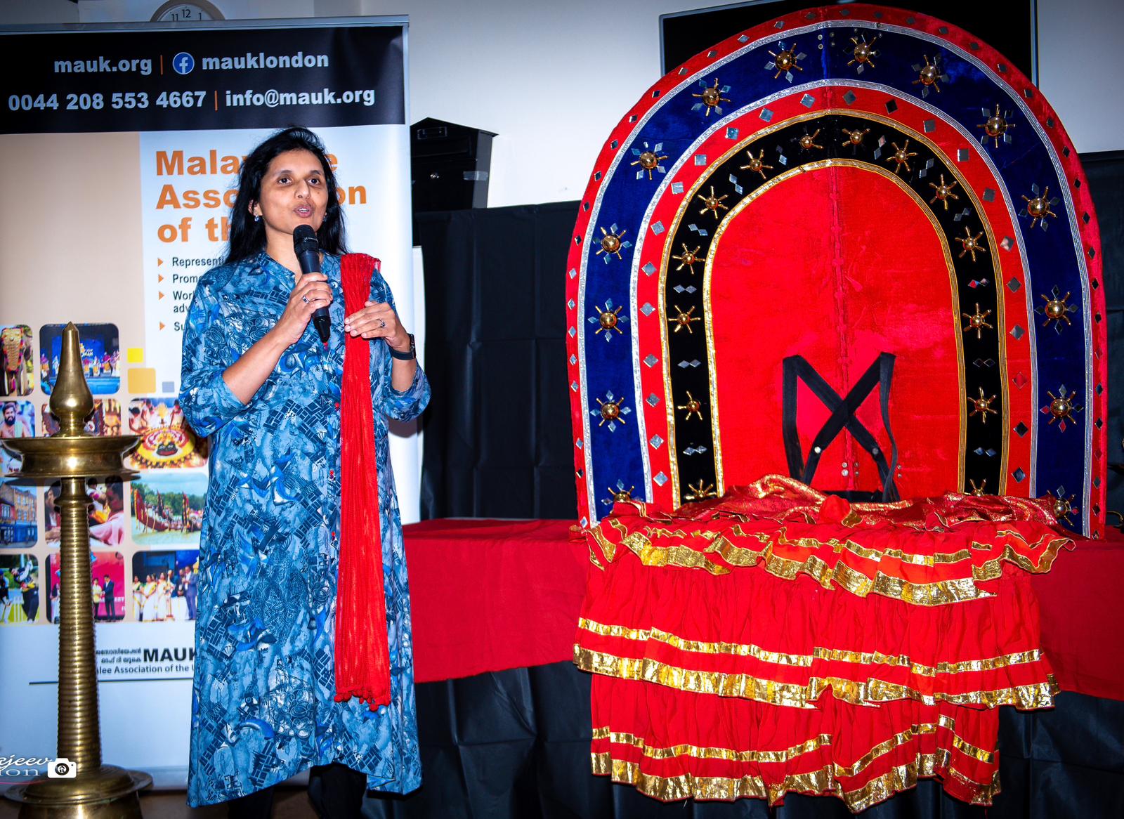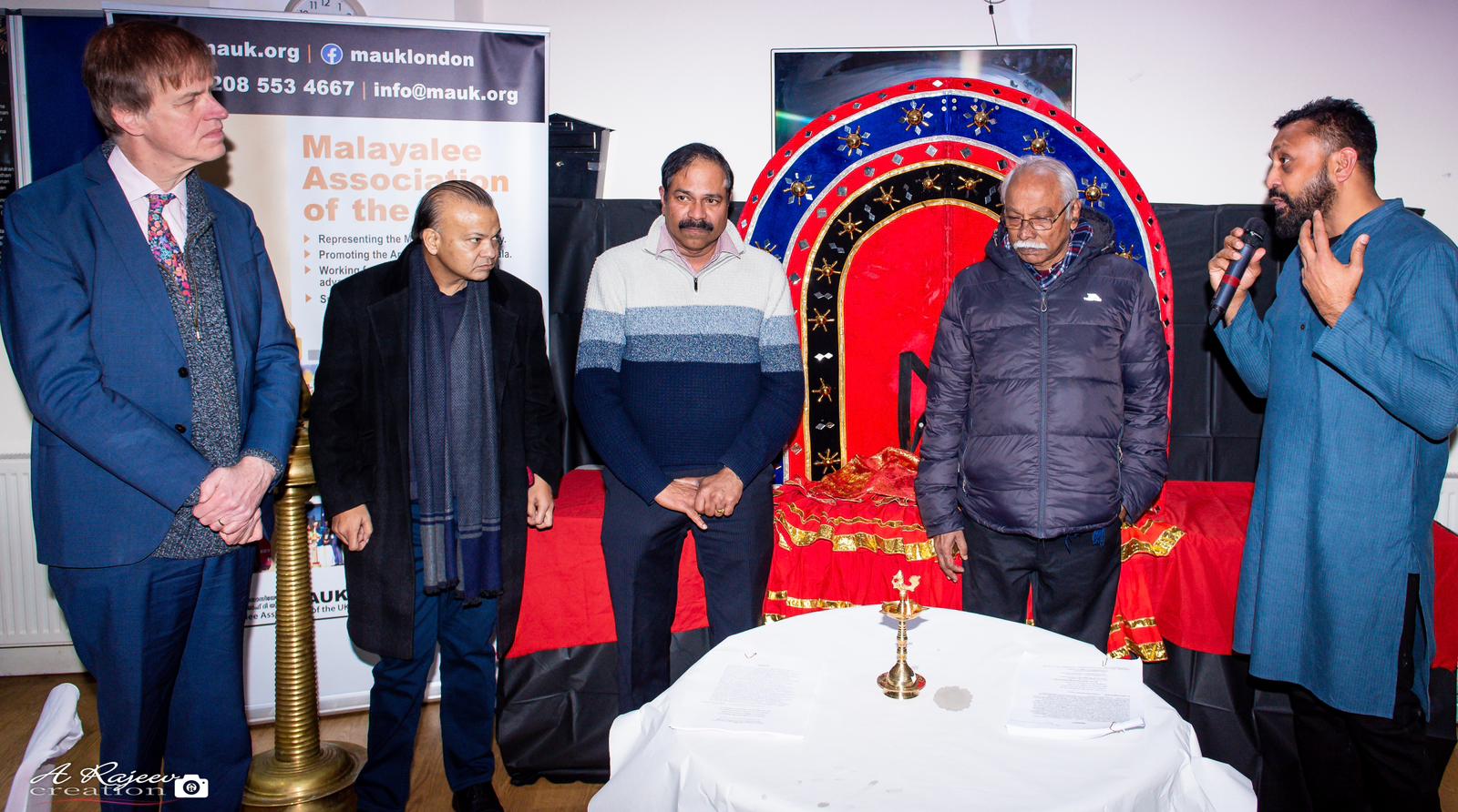 M.A.U.K Secretary and host of the evening, Sreejith Sreedharan, formally welcomed the guests and dignitaries. Anilkumar Edavana, M.A.U.K Chairperson, addressed the audience and reiterated M.A.U.K’s commitment to promoting the traditional and ritual arts of Kerala in the U.K. This was followed by Member of Parliament for East Ham, Sir Stephen Timms, conducting the inauguration by lighting the traditional lamp. The backdrop was a striking display of a flamboyant Theyyam costume and truly majestic headgear, setting the scene and filling the atmosphere with awe and wonder. Sir Timms spoke about M.A.U.K’s outstanding contribution to the local society and praised its innovative vision and passionate delivery of services in the arts, culture and poverty reduction.